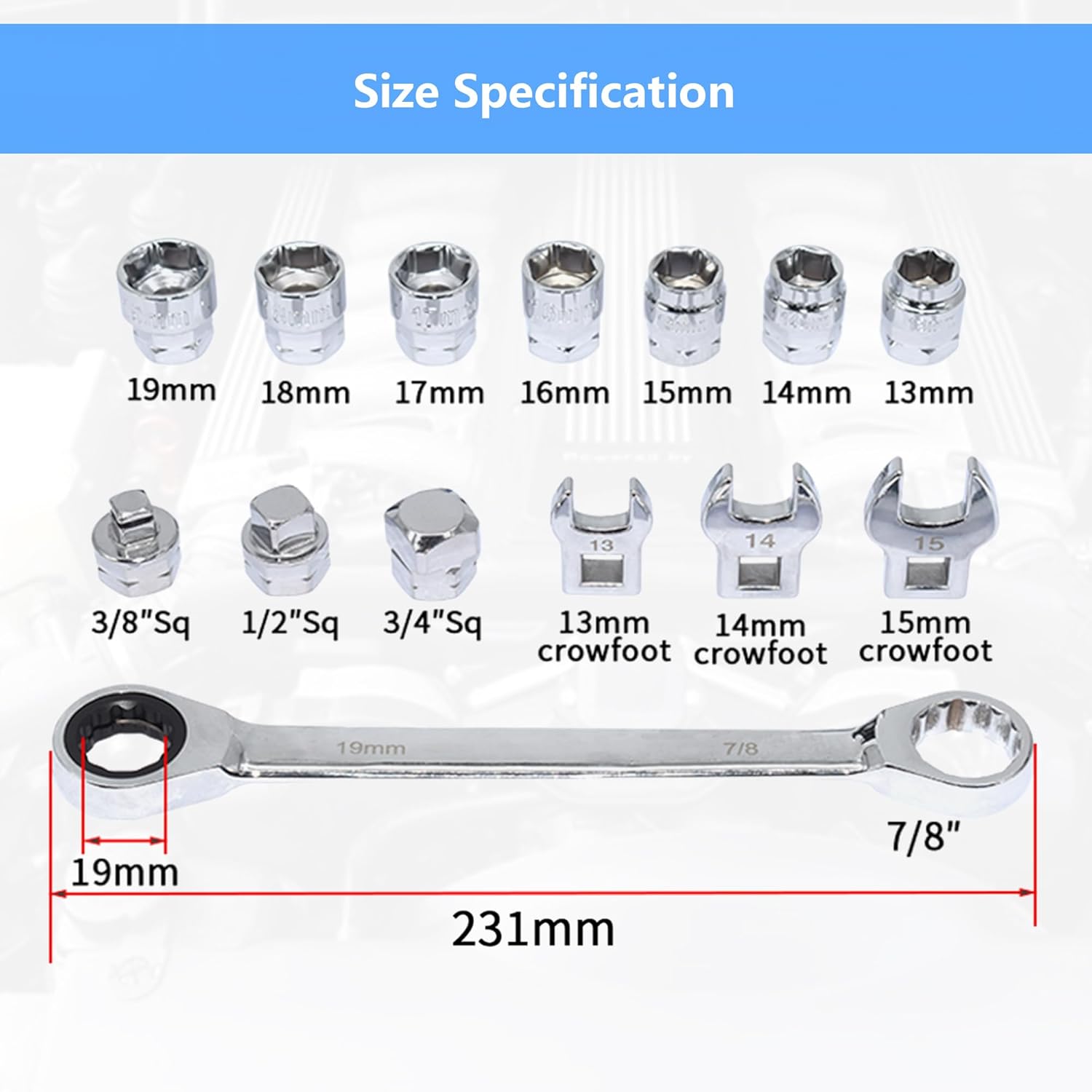 7 × 6-point low-profile sockets: 13mm, 14mm, 15mm, 16mm, 17mm, 18mm, 19mm